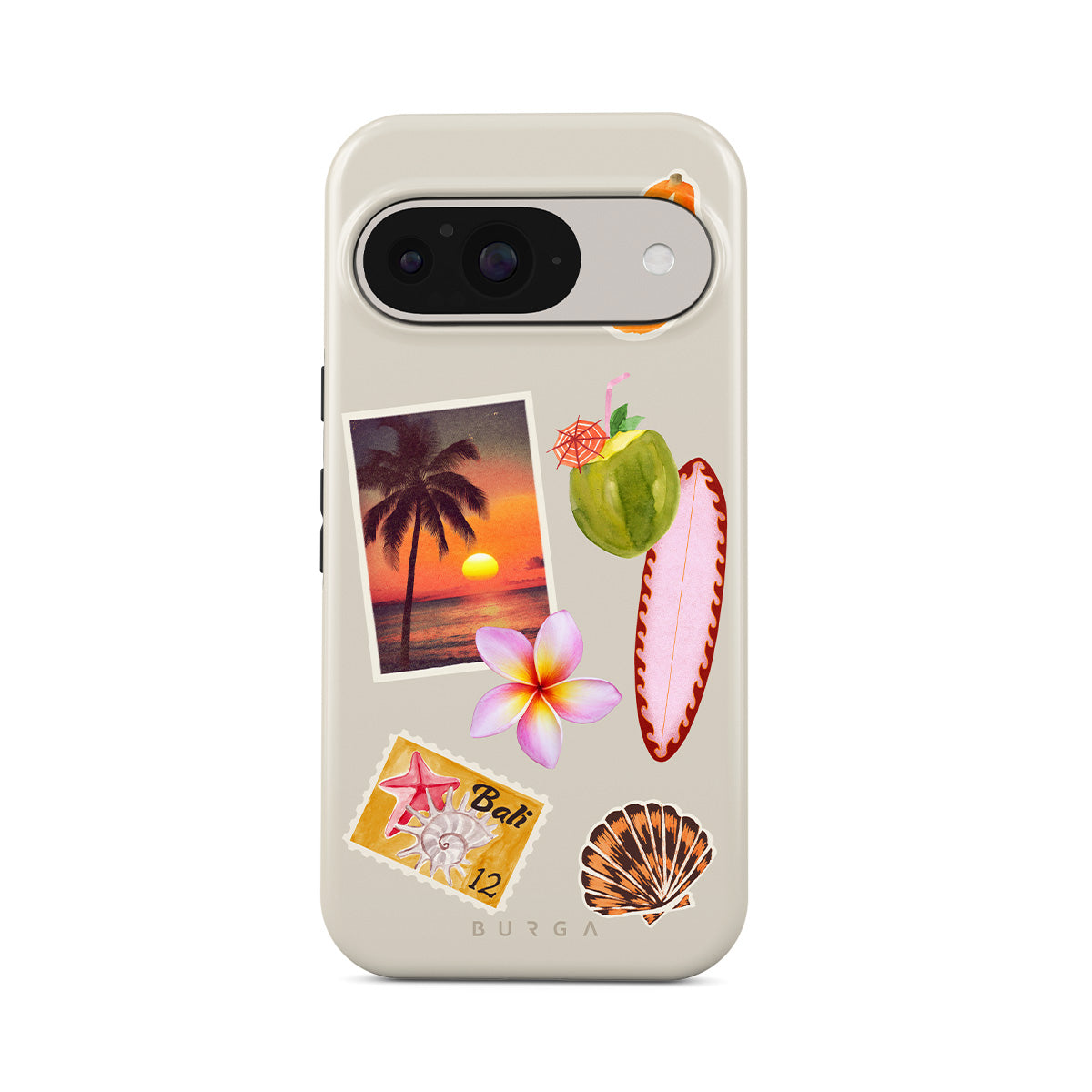 Typické pro tento motiv: fotografii tropického západu slunce, papáju, zelený kokosový ořech, růžový surf, růžový květ plumérie, oranžovou mušličku, pohlednici z Bali.