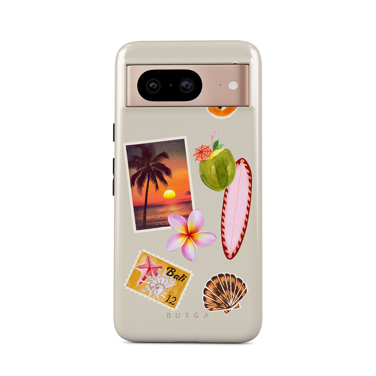 Typické pro tento motiv: fotografii tropického západu slunce, papáju, zelený kokosový ořech, růžový surf, růžový květ plumérie, oranžovou mušličku, pohlednici z Bali.