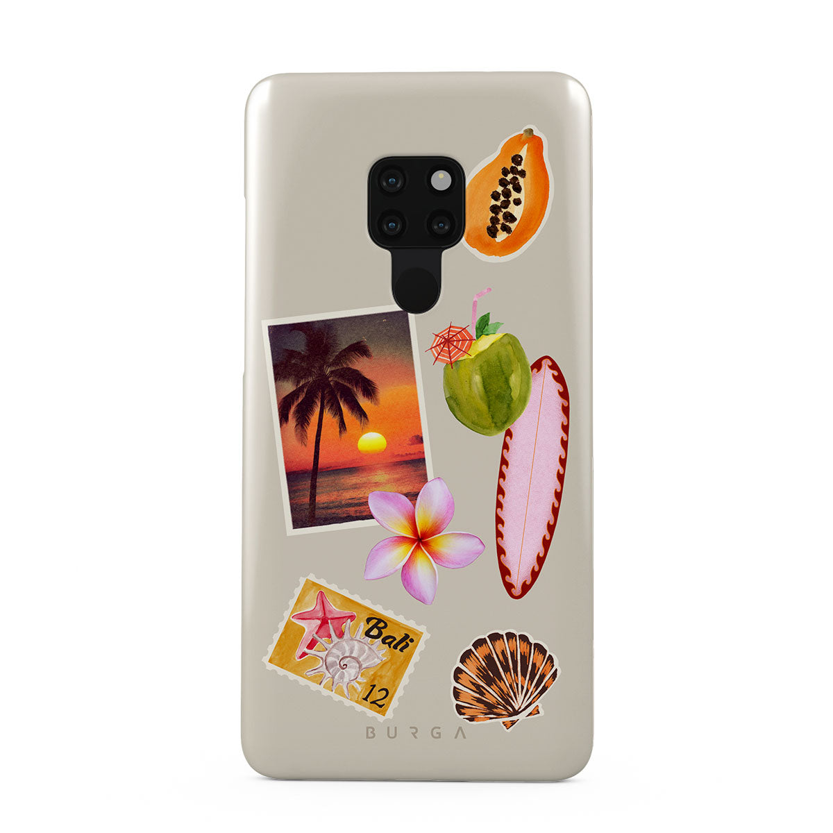 Typické pro tento motiv: fotografii tropického západu slunce, papáju, zelený kokosový ořech, růžový surf, růžový květ plumérie, oranžovou mušličku, pohlednici z Bali.