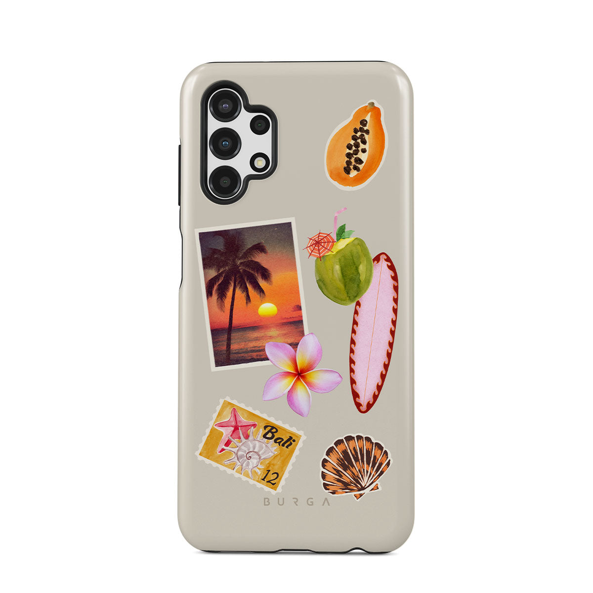 Typické pro tento motiv: fotografii tropického západu slunce, papáju, zelený kokosový ořech, růžový surf, růžový květ plumérie, oranžovou mušličku, pohlednici z Bali.