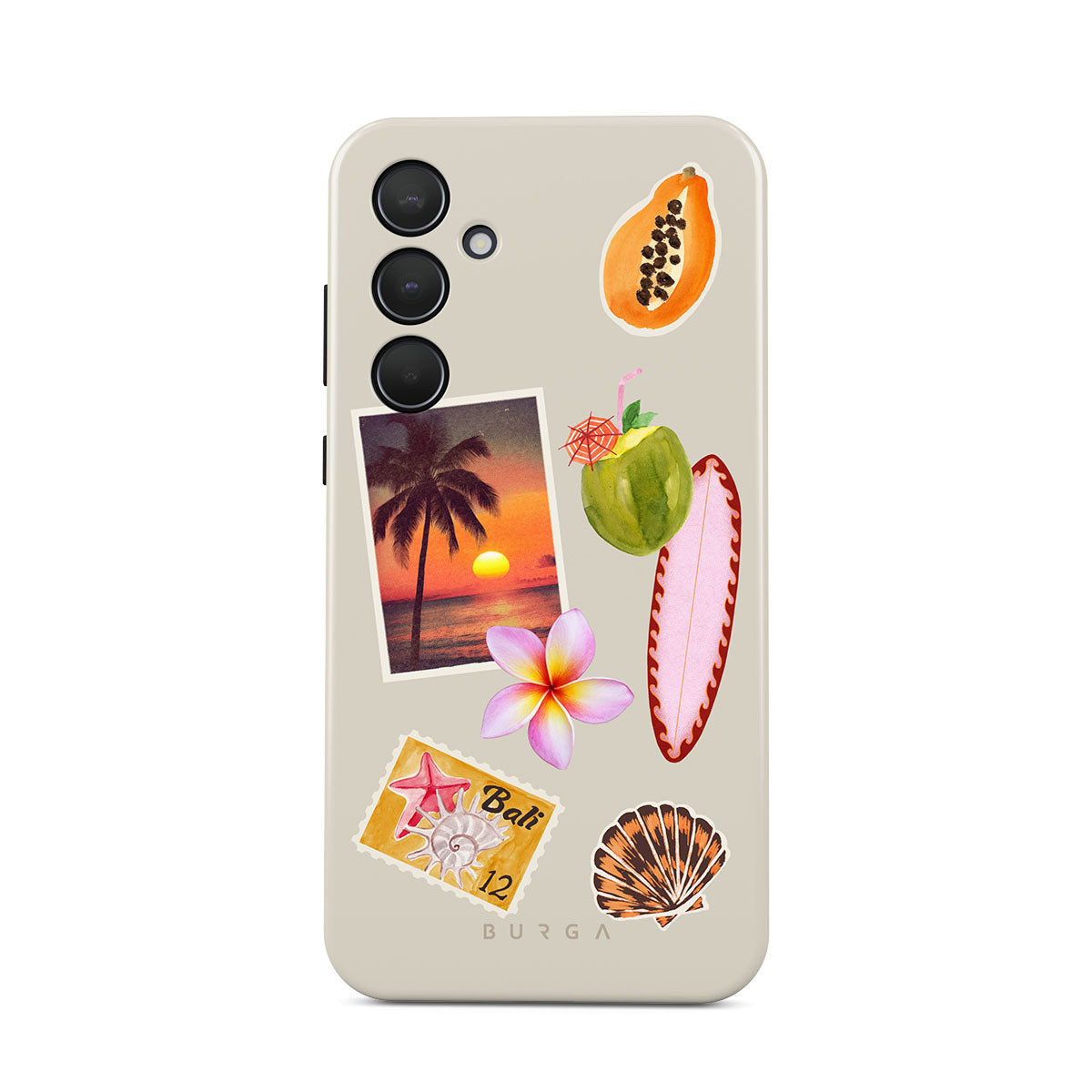 Typické pro tento motiv: fotografii tropického západu slunce, papáju, zelený kokosový ořech, růžový surf, růžový květ plumérie, oranžovou mušličku, pohlednici z Bali.