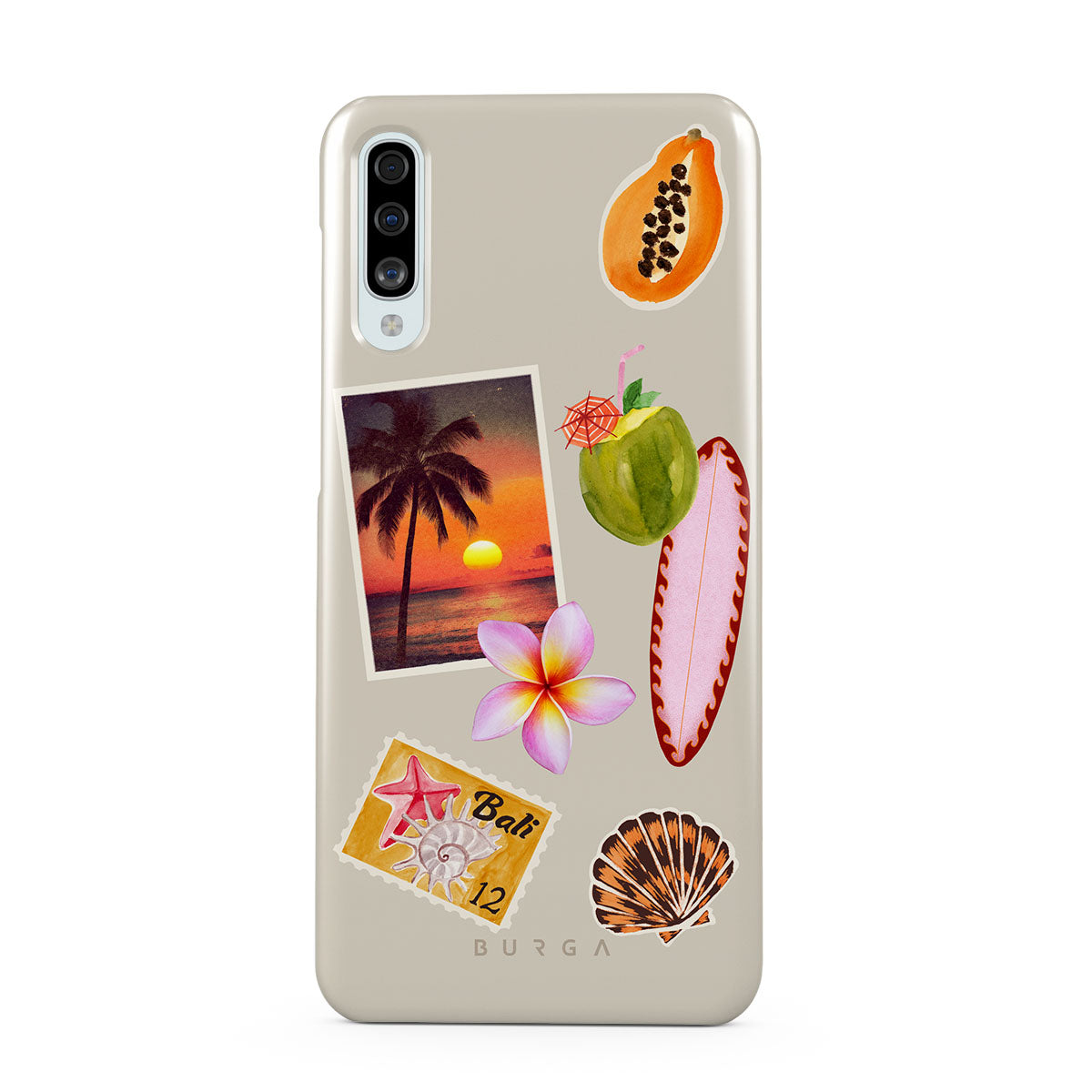 Typické pro tento motiv: fotografii tropického západu slunce, papáju, zelený kokosový ořech, růžový surf, růžový květ plumérie, oranžovou mušličku, pohlednici z Bali.