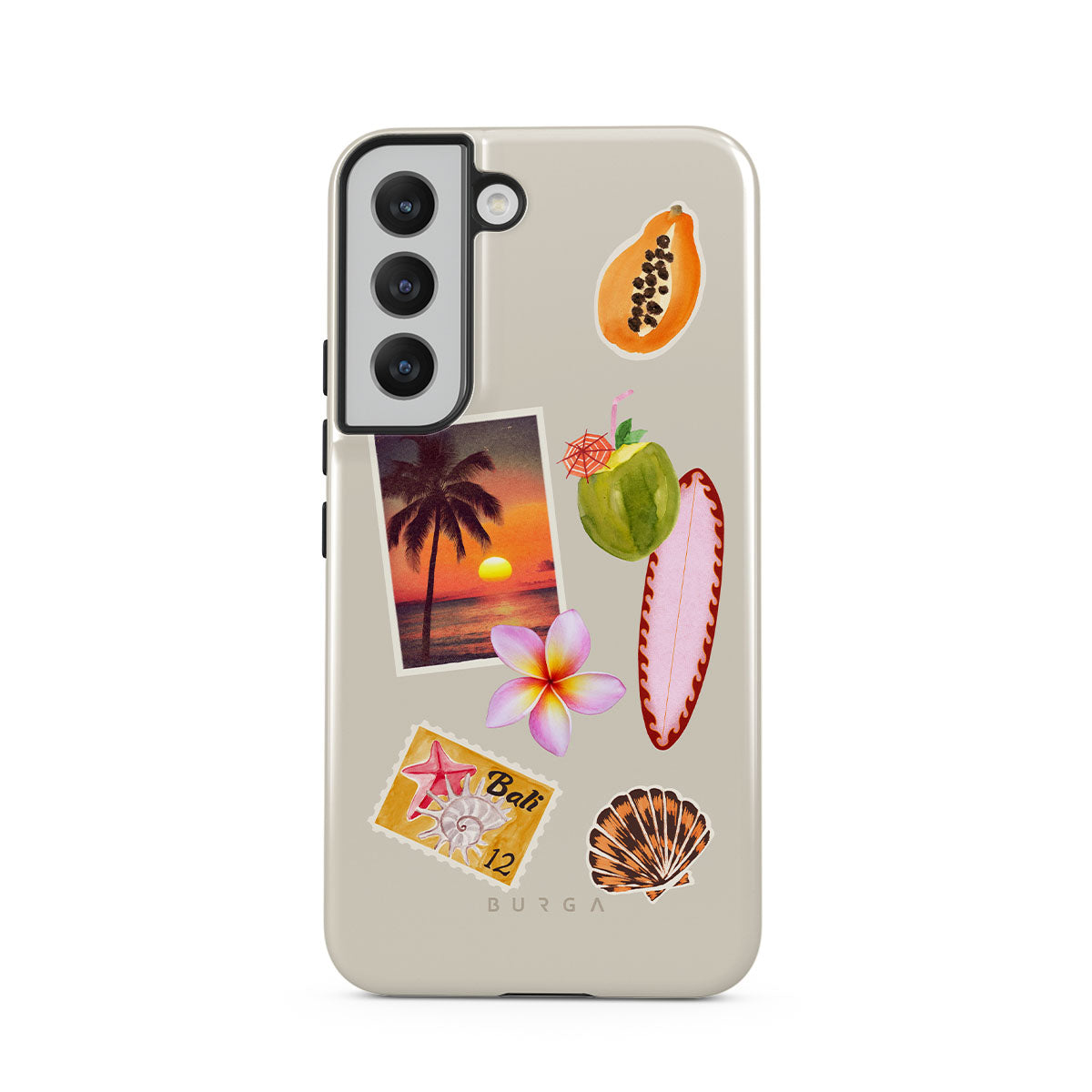 Typické pro tento motiv: fotografii tropického západu slunce, papáju, zelený kokosový ořech, růžový surf, růžový květ plumérie, oranžovou mušličku, pohlednici z Bali.