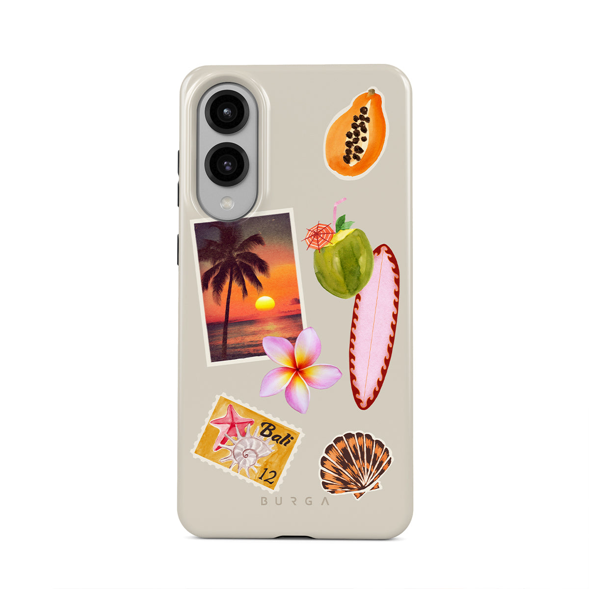 Typické pro tento motiv: fotografii tropického západu slunce, papáju, zelený kokosový ořech, růžový surf, růžový květ plumérie, oranžovou mušličku, pohlednici z Bali.