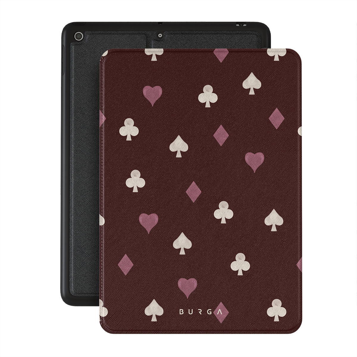 Typické pro tento motiv: karetní symboly, srdce, piky, kára, kříže, vínové pozadí