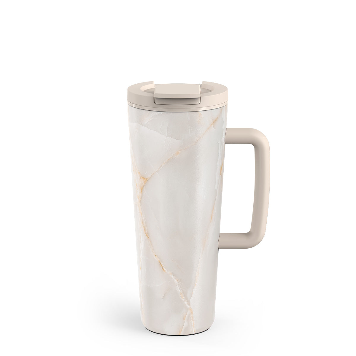 Ze všech úhlů jako dělané pro život, jaký je. Zúžená spodní část pasuje do většiny držáků na nápoje v autě. Velké držadlo ti dodá pocit stability, když jsi na cestách. Neklouzající gumová podložka chrání stůl a předchází převržení.